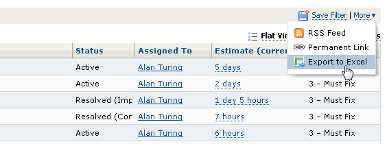 View your case list offline by using the Export to Excel feature, found under the More menu in the filter toolbar. FogBugz converts your case list into a CSV ("Comma-Separated Value") format, which is supported by Excel and other spreadsheet tools.